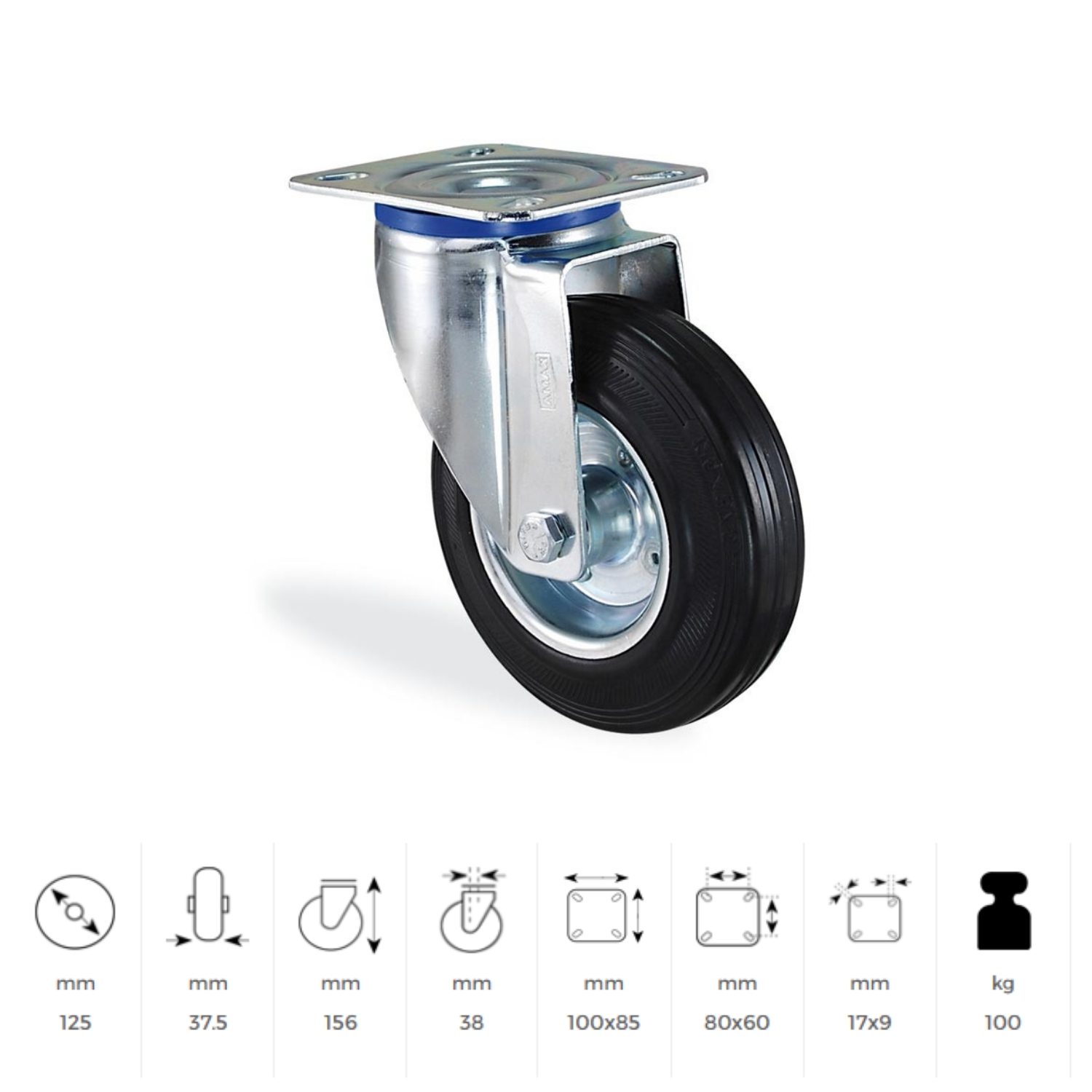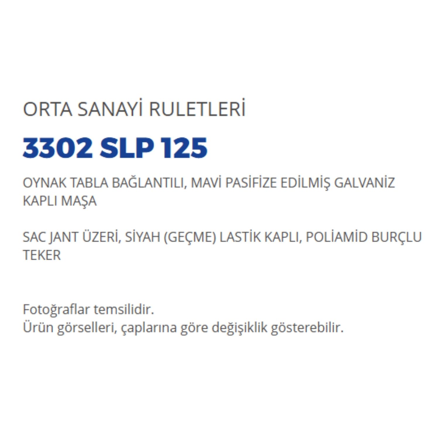 3302 Slp 125 Oynak Tabla Bağlantılı, Mavi Pasifize Edilmiş Galvaniz Kaplı Maşa Sac Jant Üzeri, Siyah (geçme) Lastik Kaplı, Poliamid Burçlu Teker
